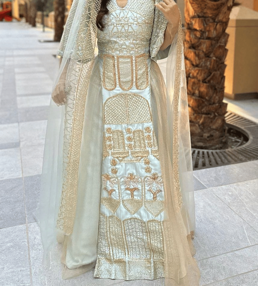 At this year’s Saudi Cup, we can see designers who take heritage symbols and present them in a contemporary, aesthetic form. For example, designer Riham Nasser’s “Bint Al-Balad” design is inspired by the rawasheen and balcony railings of the doors and windows in Historic Jeddah. Here, the designer brings together several elements in an orderly way to create a tribute to these architectural arts.